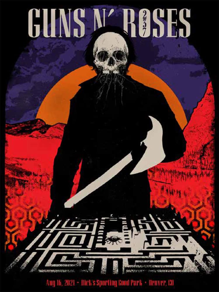 Shining" which was filmed at The Stanley Hotel in Colorado. The silhouette of Jack Torrance, the film's protagonist takes center stage, with the hedge maze from the film positioned below him. The repeating red pattern is the design of the iconic carpet from the film's hotel, and the number 237 references the film's mysterious and dangerous Room 237. The name of the venue features a typographical error ("Good" instead of "Goods"). |