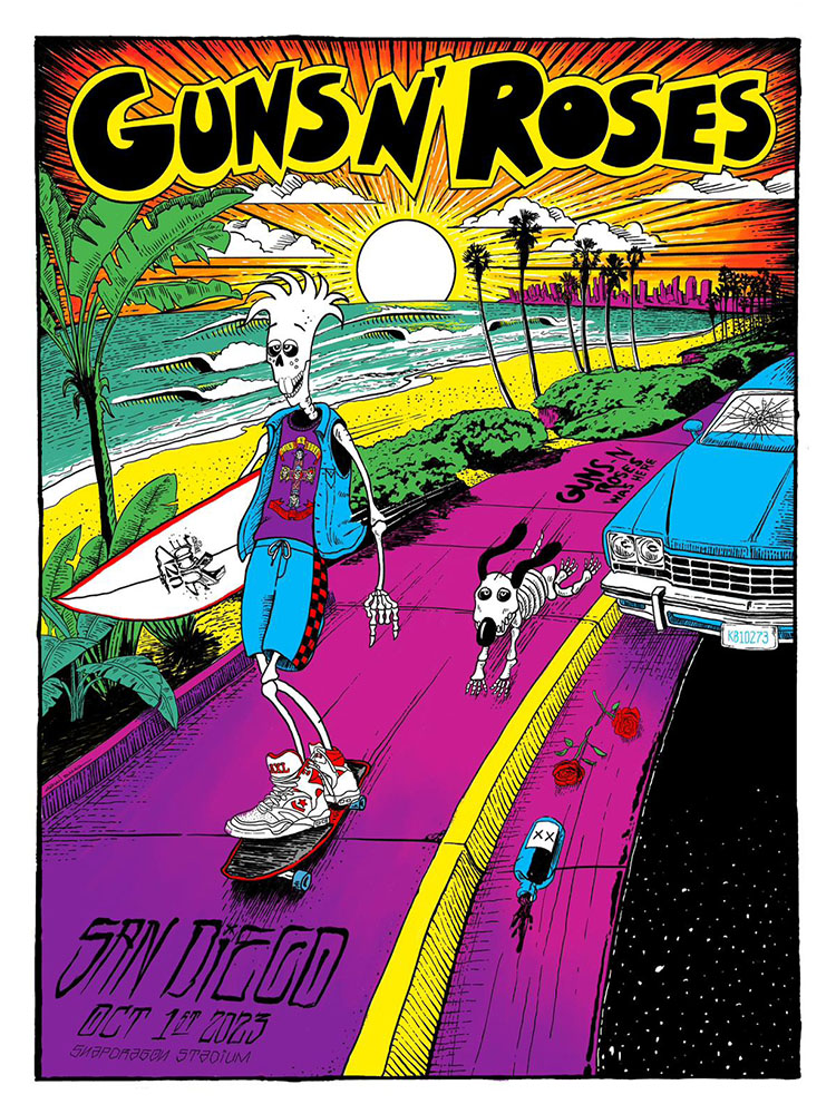 An homage to the surfer character Wilbur Kookmeyer by artist Bob Penuelas. Also featured are Axl's iconic Converse shoes and the vintage UZI Suicide logo.